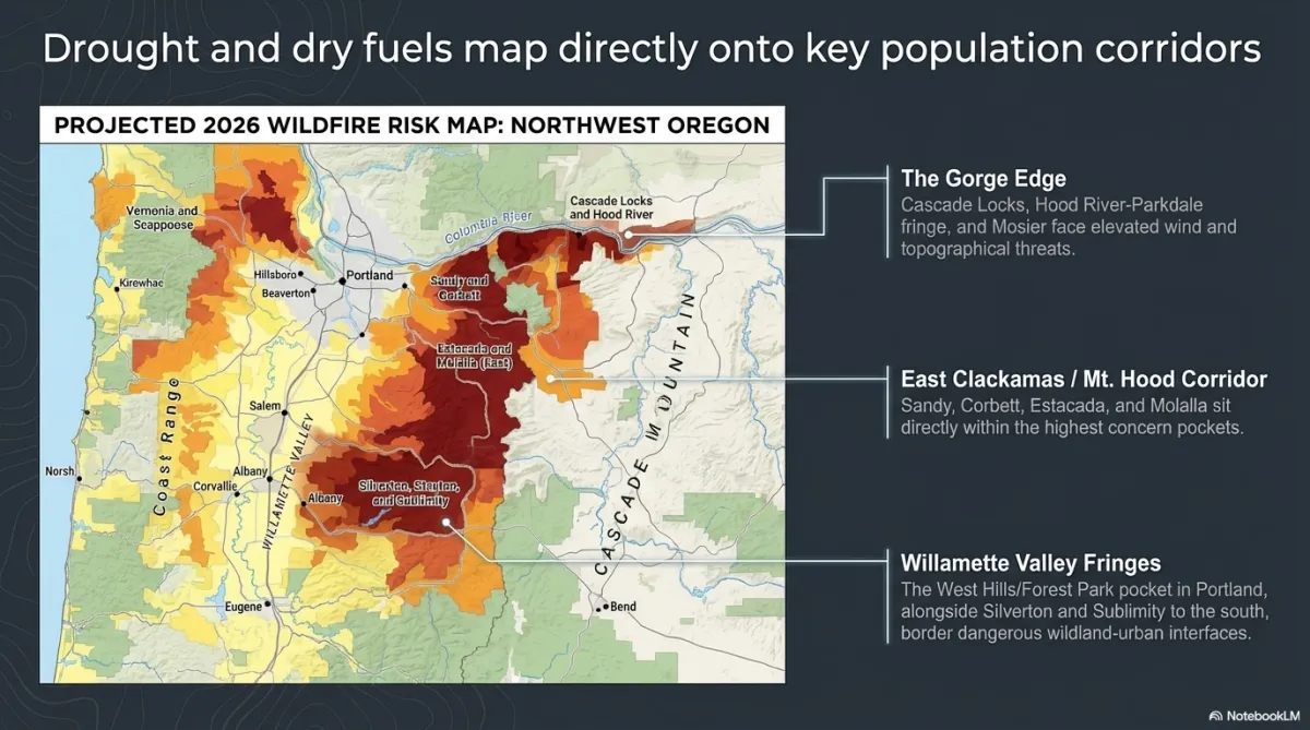 A Northwest Oregon-focused guide covering current wildfire pressure, higher-risk corridors, terrain-driven fire behavior, ember exposure, defensible space, and a step-by-step mitigation timeline.